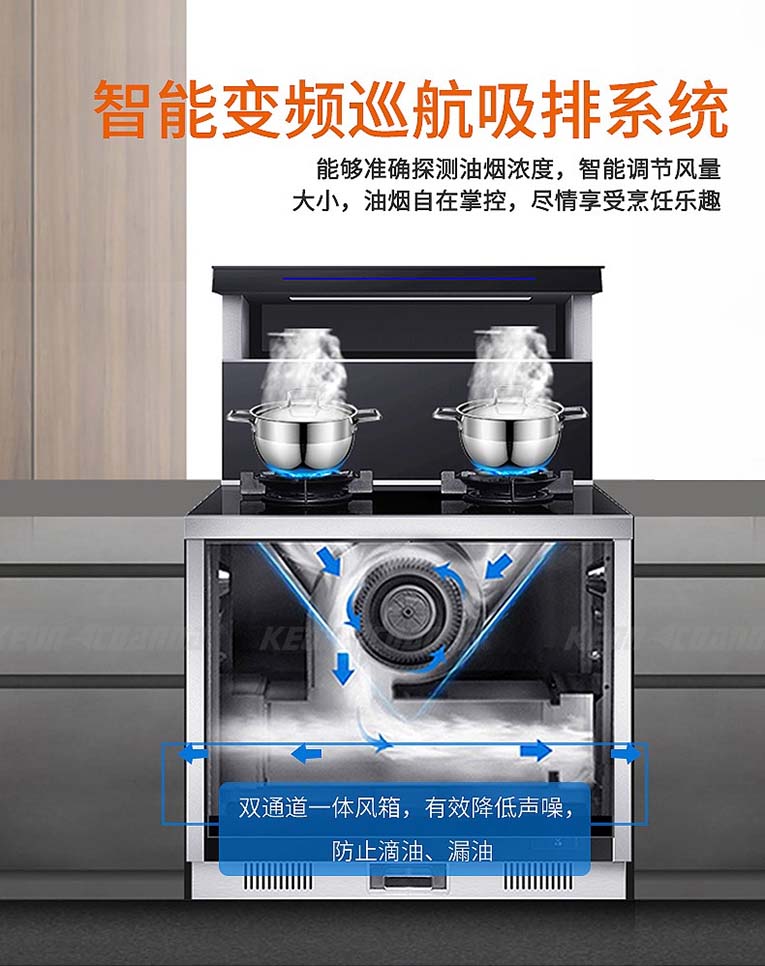 科恩D151X變頻大吸力集成灶功能實(shí)現(xiàn)多樣化,上炒下蒸烤能同時(shí)進(jìn)行,蒸烤過程耗時(shí)短、效率高,噴氣式4D立體蒸技術(shù)保留了食物的原滋原味,采用智能變頻巡航吸排系統(tǒng),能夠準(zhǔn)確探測(cè)油煙濃度,智能調(diào)節(jié)風(fēng)量大小,油煙自在掌控,最大幅度減輕油煙排出的阻力和熱量,排油煙更通暢、更高效、更徹底,油煙吸凈率更高,讓油煙無處可逃。