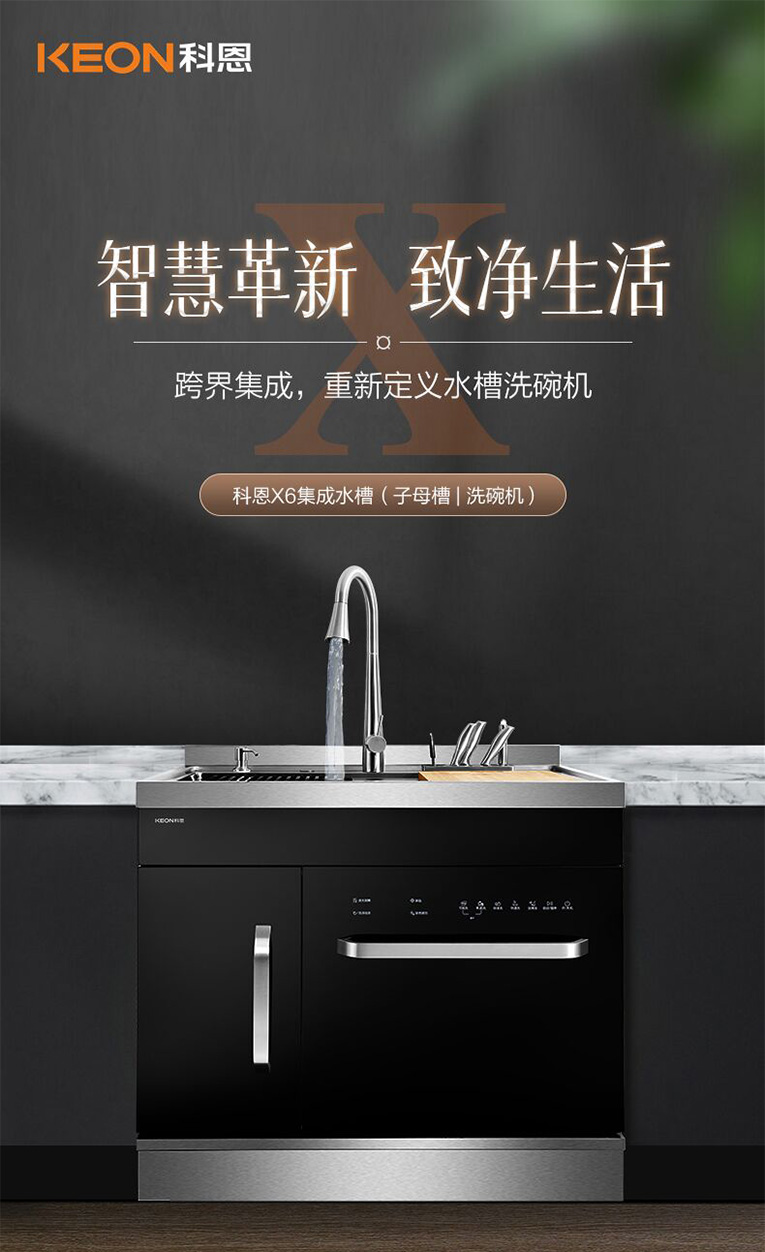洗滌區(qū)集成革命,科恩X6集成水槽解放雙手!寧可燒飯也不洗碗,X6集成水槽核心是將水槽、洗碗機、切菜板、瀝水籃等功能集成一體,解決空間問題,真正做到洗、消、烘、存一體,節(jié)約餐后洗碗時間,可以更好的陪伴家人。