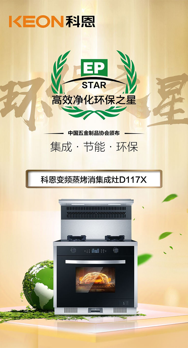 科恩D117X集成灶在眾多品牌中脫穎而出,斬獲由中國五金制品協(xié)會頒發(fā)的2020年中國集成灶“高效凈化環(huán)保之星”。