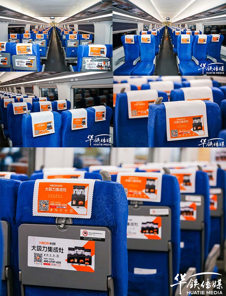 走進(jìn)“科恩號(hào)”車廂,從天幕、海報(bào)、電子屏到小桌板,都是來自科恩集成灶的霸屏推送。