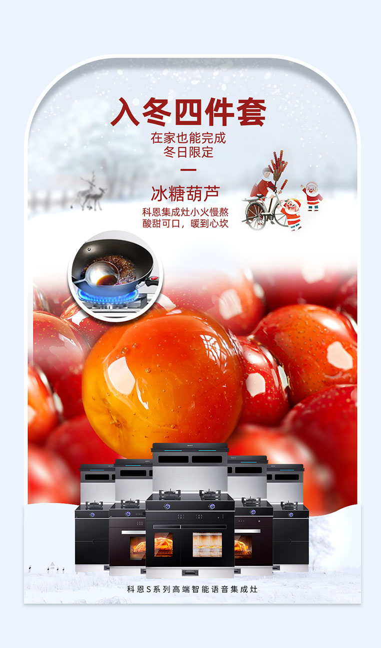 除了有暖呼呼的紅薯和栗子外,當然也少不了酸酸甜甜的冰糖葫蘆了,咬開糖葫蘆嘎嘣脆的糖衣,山楂的酸甜涌入,瞬間回到那個無憂無慮的童年,科恩集成灶必須給安排上!