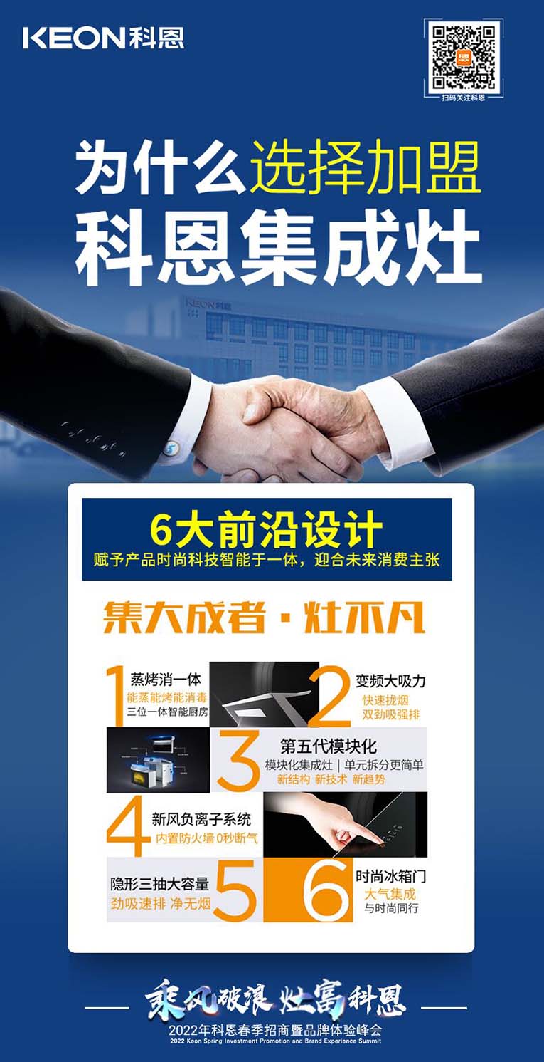 “乘風(fēng)破浪,灶富科恩”2022科恩春季招商暨品牌體驗峰會將于3月18日舉行,選擇大于努力,抓住時代機遇!集成灶十大品牌、廚電行業(yè)十大品牌科恩集成灶具備優(yōu)于業(yè)界的技術(shù)、高質(zhì)量的保證、強大的企業(yè)實力、有保障的售后等優(yōu)勢,實力加盟的不錯之選。