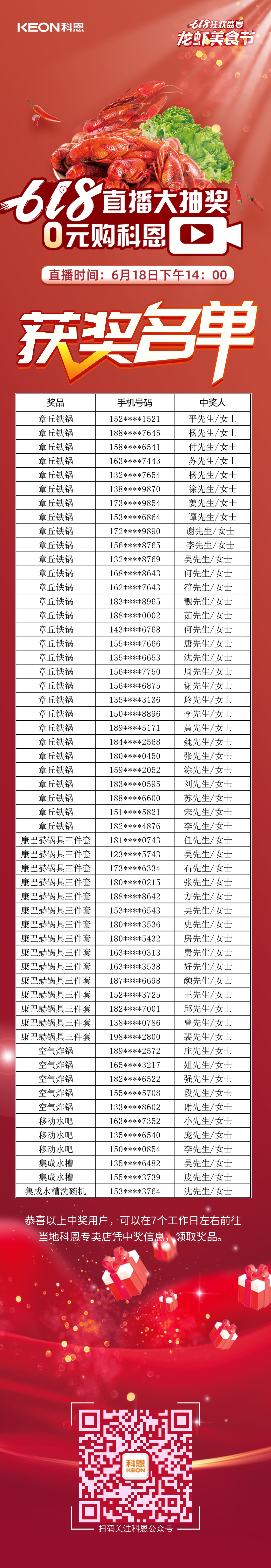 萬人品美食,0元搶科恩——科恩龍蝦美食節(jié)圓滿落幕,千城千店,共襄盛舉,感謝大家對科恩集成灶的大力支持,618直播大抽獎(jiǎng)獲獎(jiǎng)名單火熱出爐,恭喜以上獲獎(jiǎng)的小伙伴們,請盡快聯(lián)系當(dāng)?shù)?a href="http://www.54906.com.cn/" target="_blank">科恩門店,快把獎(jiǎng)品領(lǐng)回家吧!