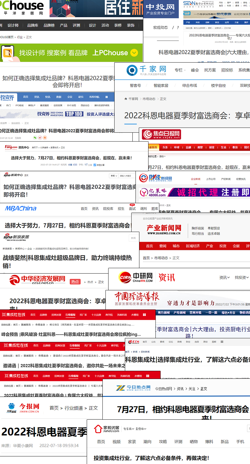 新浪家居、網(wǎng)易家居、太平洋家居網(wǎng)、環(huán)球家電網(wǎng)、廚電行業(yè)資訊、集成灶在線、大眾網(wǎng)、中華網(wǎng)、今報(bào)網(wǎng)、財(cái)經(jīng)新聞網(wǎng)、中國貿(mào)易新聞、經(jīng)濟(jì)發(fā)展網(wǎng)、家電消費(fèi)網(wǎng)、新浪財(cái)經(jīng)頭條、中投網(wǎng)、千家網(wǎng)等幾十家重量級(jí)媒體爭(zhēng)相報(bào)道,2022科恩夏季財(cái)富選商會(huì)內(nèi)容躋身熱門話題,引發(fā)全網(wǎng)轟動(dòng)熱潮,相信本月27日的科恩夏季選商會(huì)必將引爆全網(wǎng),熱力滿滿!