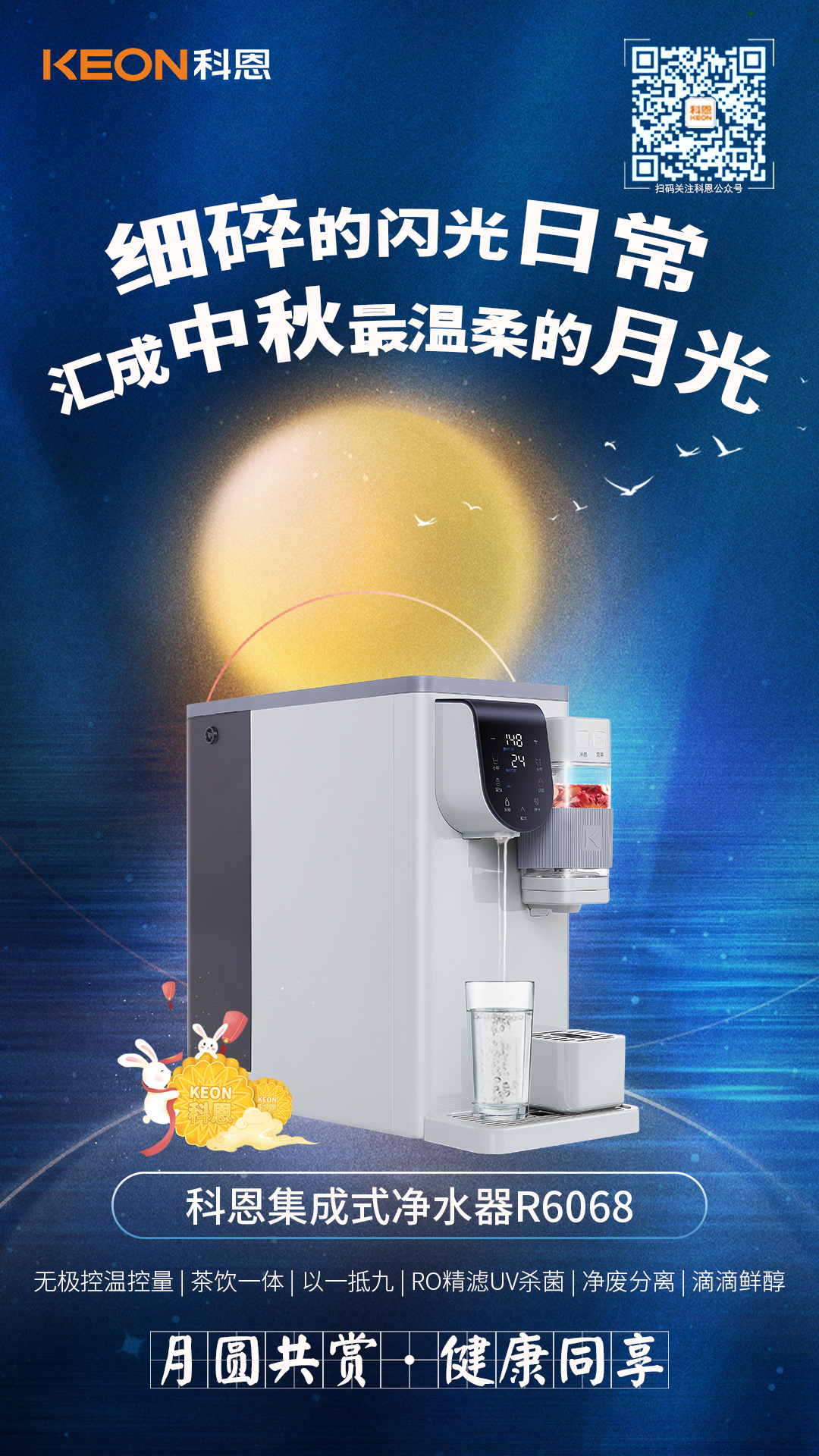 生活是一半人間煙火,一半山河遠闊,你眺望詩和遠方,卻也別忘了家的方向,卸下滿身疲憊,拋開城市的車水馬龍,用一臺科恩集成式凈水器R6068,一杯咖啡一壺清茶一杯溫度適宜的熱水,細碎的閃光日常,倒?jié)M愛的溫度,匯成中秋最溫暖的月光!