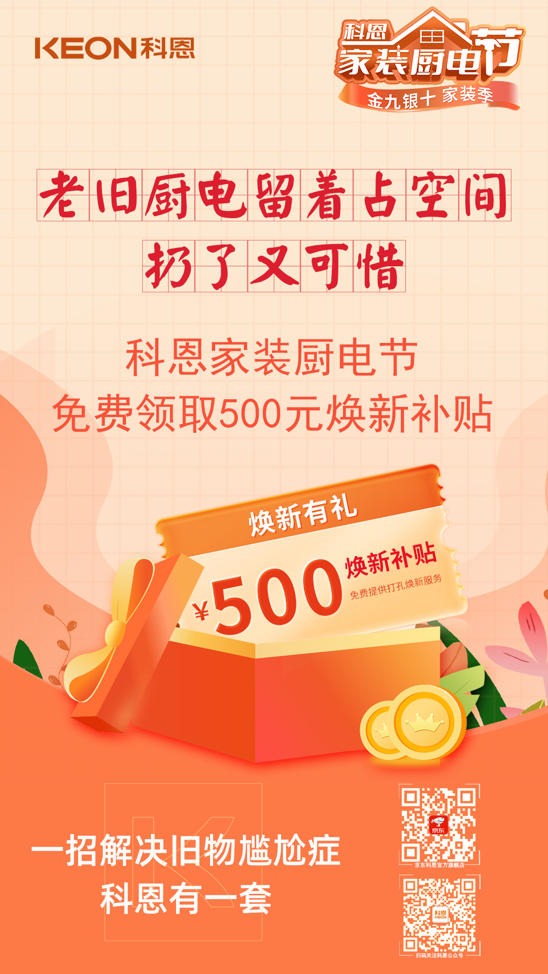金九銀十家裝季,科恩家裝廚電節,1元特權卡,樂享六喜禮,福利連連,驚喜不斷,趁此機會,用更優惠的價格購得稱心如意的廚電好物,年前入住美滋滋!