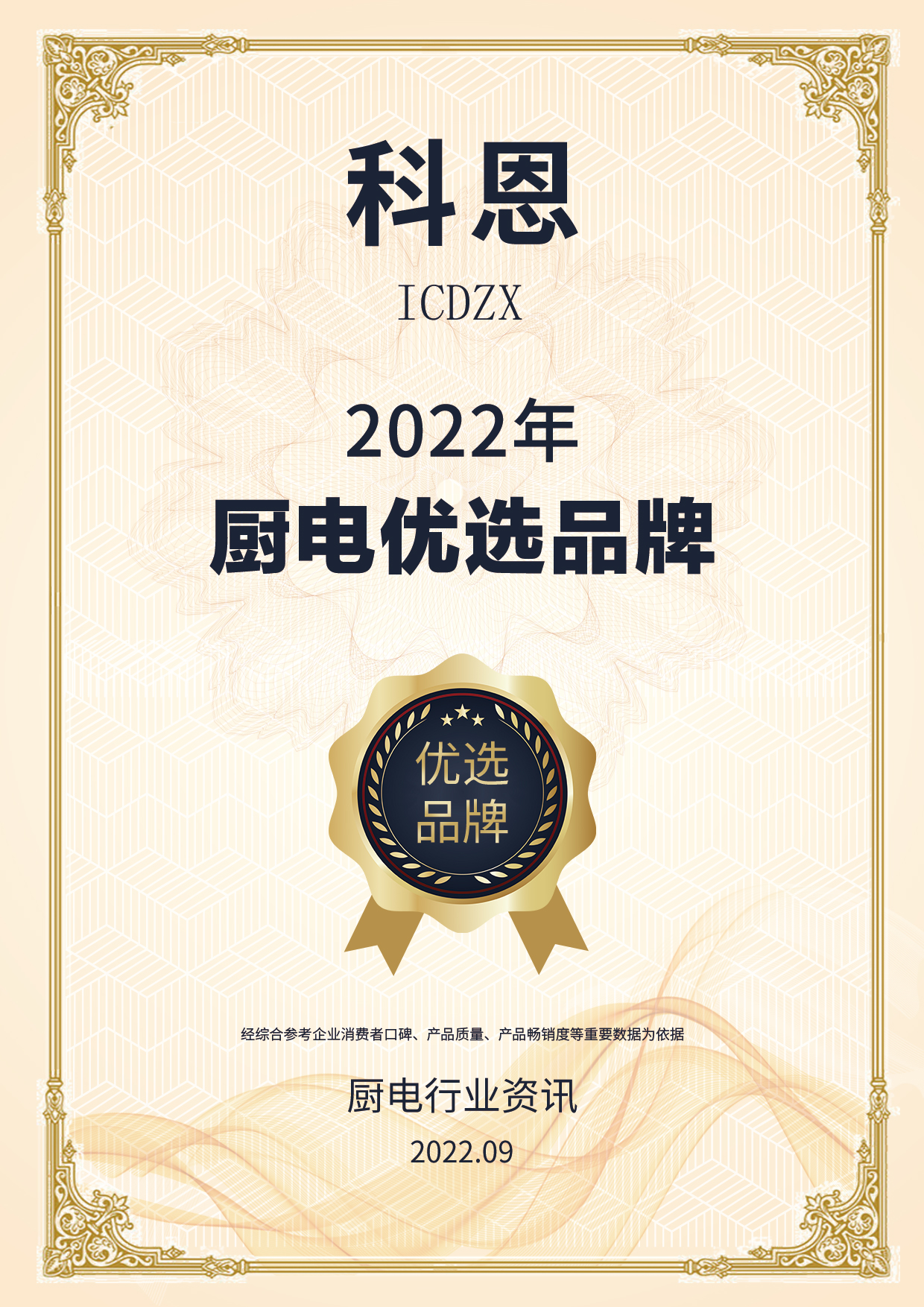 2022年9月作為我國第45個質量月,廚電行業資訊(ID:cdhyzx00809)特舉辦了2022年度質量月之廚電&集成灶優選品牌評比(全國網絡評選),意在為廣大消費者與經銷商篩選出口碑好、產品質量優、售前售后服務到位的品牌。自評比活動啟動以來,經過企業綜合實力篩選、資格初審、后臺評論、留言推薦、數據核對、綜合評審等階段,科恩電器憑借強大的品牌實力、優質的產品性能、領先出色制造工藝在諸多品牌中脫穎而出,斬獲兩大優選品牌雙殊榮!