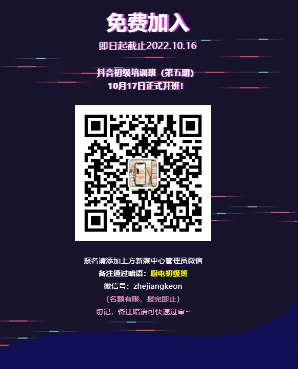 目前,第五期抖音實(shí)戰(zhàn)訓(xùn)練營初級班已全面啟動(dòng),欲報(bào)從速!歡迎在此留言報(bào)名或者添加科恩新媒體官方微信搶占名額!科恩新媒體官方微信:zhejiangkeon