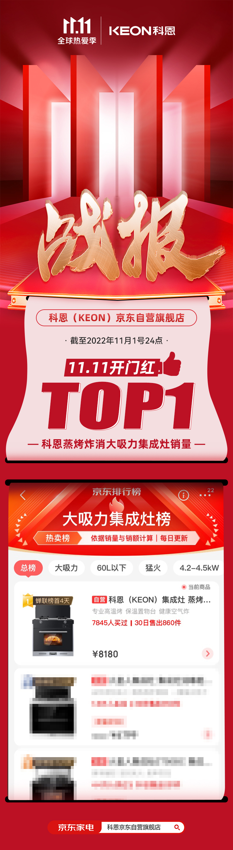 科恩雙11開門紅戰(zhàn)報(bào)正式出爐,截止2022年11月1日24點(diǎn),雙11開門紅開搶28小時(shí),科恩集成灶榮登大吸力集成灶榜TOP1,實(shí)力登榜,權(quán)威見證!