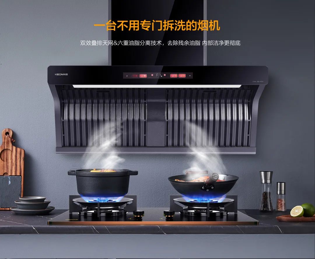 現代人廚房生活討厭TOP榜單第一名:煙機清洗!為解決這個難題,科恩研發了免清洗煙機,雙效疊排天網,將油煙層層阻攔,油脂分離高達96%!煙機免清洗,廚房更省心!