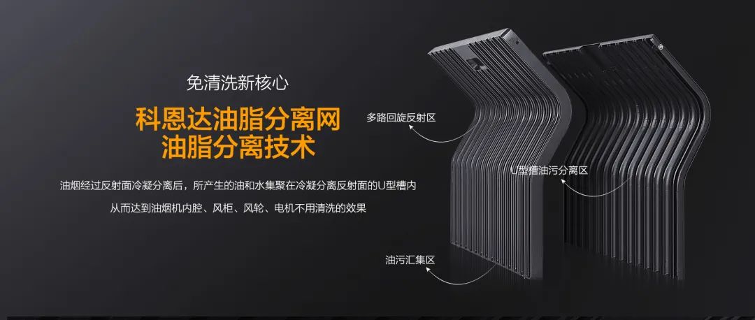 科恩免清洗煙機獨創雙效疊排天網,采用易潔太空壓鑄鋁材,搭配酸洗-噴砂工藝加之特氟龍噴涂最后高溫燒結,不僅不沾油、易清潔更好打理。在分離油煙的同時,還能阻燃阻熱!保障廚房安全!