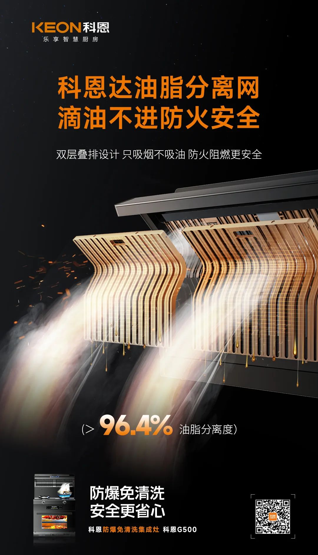 在傳統(tǒng)的10大安全前提之下,科恩G500新加入,防火科恩達(dá)油脂分離網(wǎng)、金剛防爆面板,為廚房安全再度升級(jí)防護(hù)。