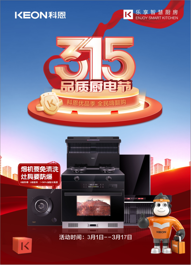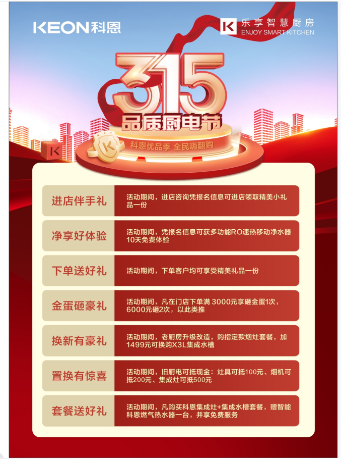 科恩315品質(zhì)廚電節(jié)”正在火熱進(jìn)行中,全國千城萬店齊獻(xiàn)7重好禮,只為帶給您全新高品質(zhì)廚房生活。