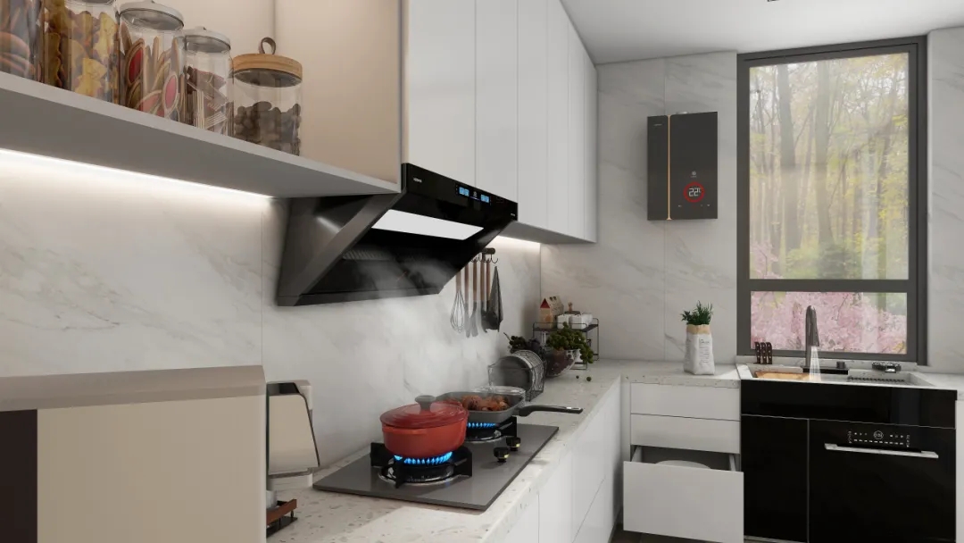 煙機(jī)方面:科恩5100歐近式超薄油煙機(jī),采用獨(dú)特的平嵌式設(shè)計(jì),完美融入櫥柜之中。具備23m³/min颶風(fēng)吸力,可瞬吸濃煙,做到辣味不嗆鼻,妝容不油膩。