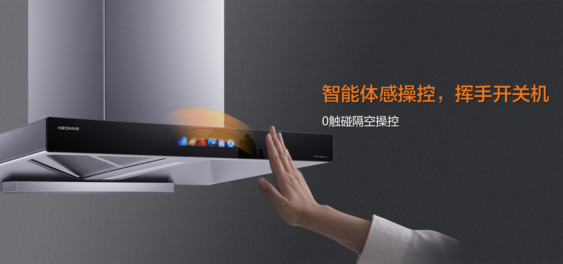 操作上,科恩T71采用智能體感操控和觸摸式彩屏按鍵相結(jié)合的方式。揮手即可開關(guān)機(jī),方便快捷,無(wú)需直接接觸油煙機(jī),避免了油污沾染。觸摸式彩屏按鍵則讓功能更加直觀,用戶可以輕松選擇不同的模式和功能。