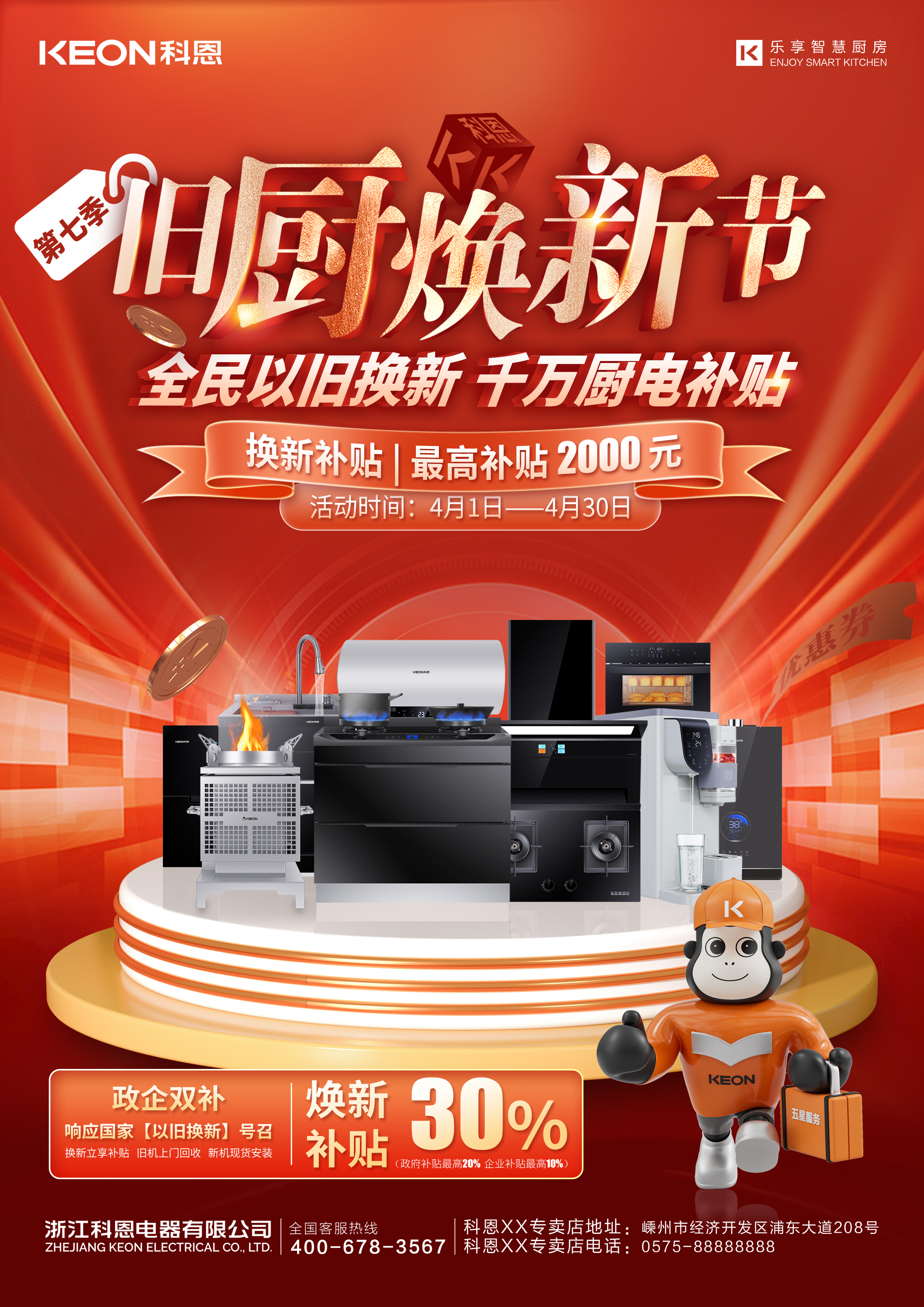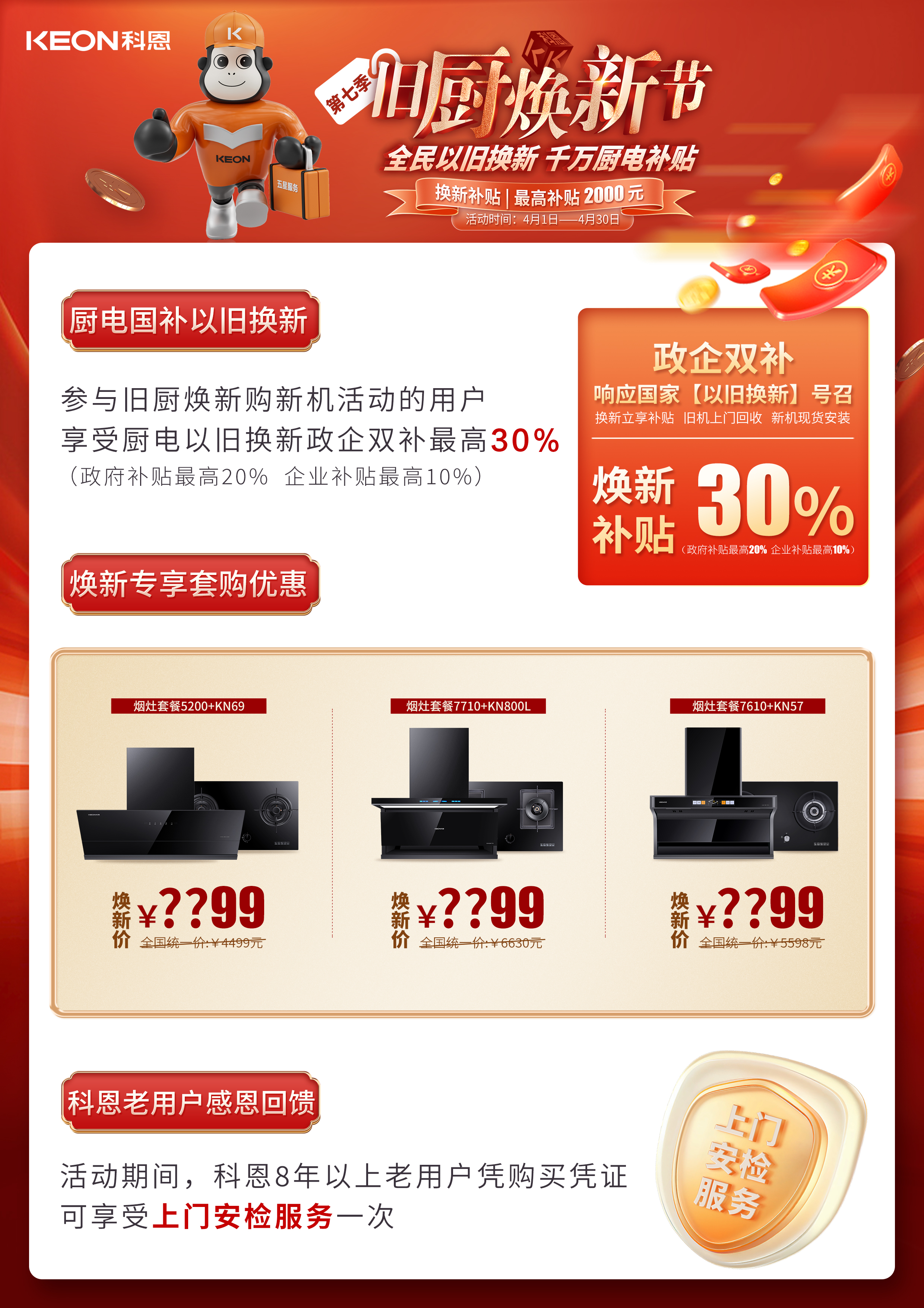 春意漸濃,煙火煥新。科恩電器四月“舊廚煥新節(jié)”全面啟動(dòng)!政府補(bǔ)貼疊加企業(yè)補(bǔ)貼,雙重福利最高直抵廚電總價(jià)30%,最高可達(dá)2000元,更有煥新專享套購(gòu)優(yōu)惠感恩回饋等福利,讓智能廚房一步到位。