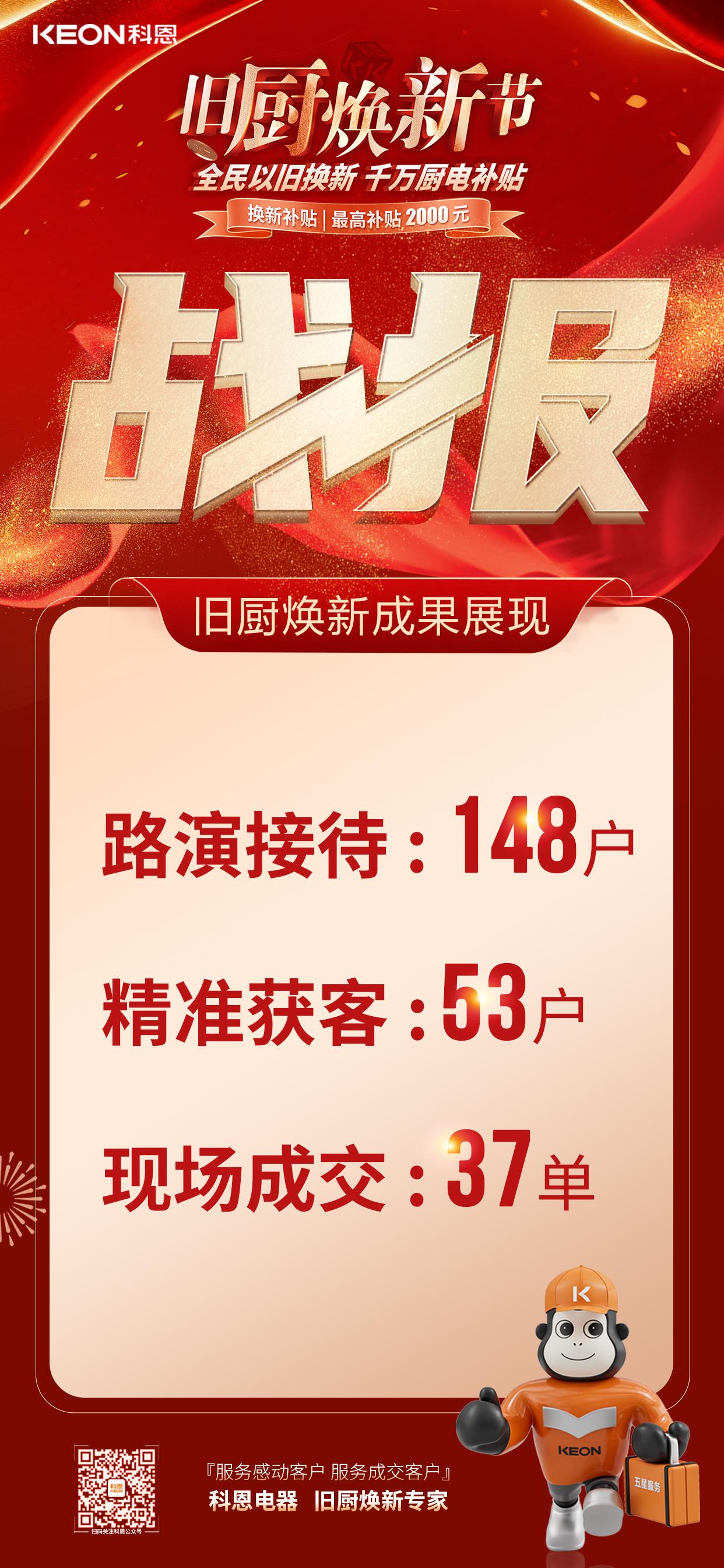 截止目前,科恩舊廚煥新路演活動(dòng)在河南、河北、江蘇、安徽、湖南等部分城市開展,為期17天,各地陸續(xù)進(jìn)行1-3天的路演,數(shù)據(jù)統(tǒng)計(jì)共接待148戶,精準(zhǔn)獲客53戶,現(xiàn)場(chǎng)成交37單,轉(zhuǎn)化率達(dá)25%,取得佳績(jī)。通過政企補(bǔ)貼降低消費(fèi)門檻,讓用戶現(xiàn)場(chǎng)體驗(yàn)智能廚電升級(jí)價(jià)值,同時(shí)為經(jīng)銷商打造營銷樣板,推動(dòng)行業(yè)綠色消費(fèi)升級(jí)。