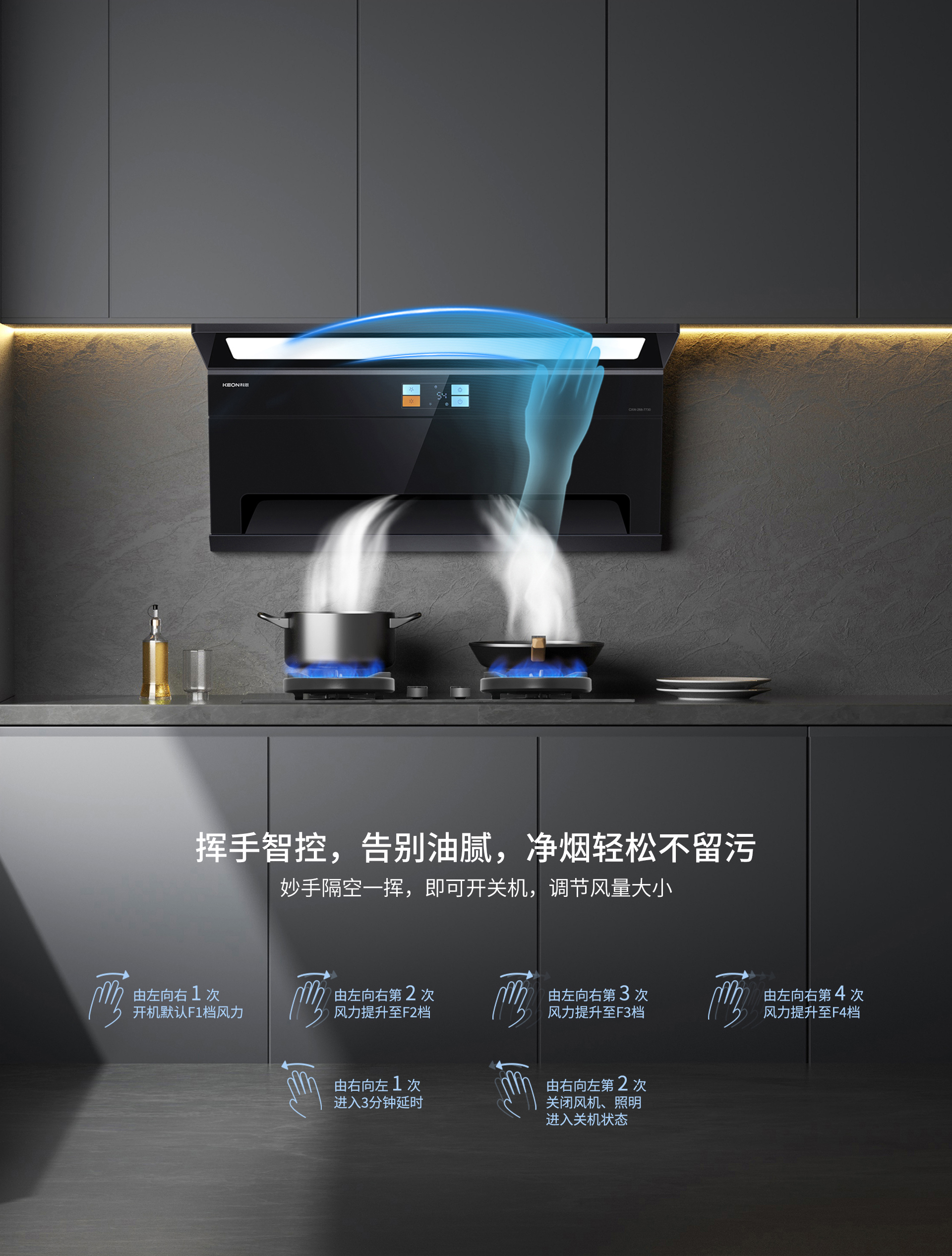 智能操控,告別油膩接觸。揮手即能掌控,雙手不沾油污,隔空一揮開關機、調(diào)風量,模塊化彩屏觸摸鍵,老人也能輕松操作,煙灶聯(lián)動,火起煙凈,打造智能便捷的廚居生活。