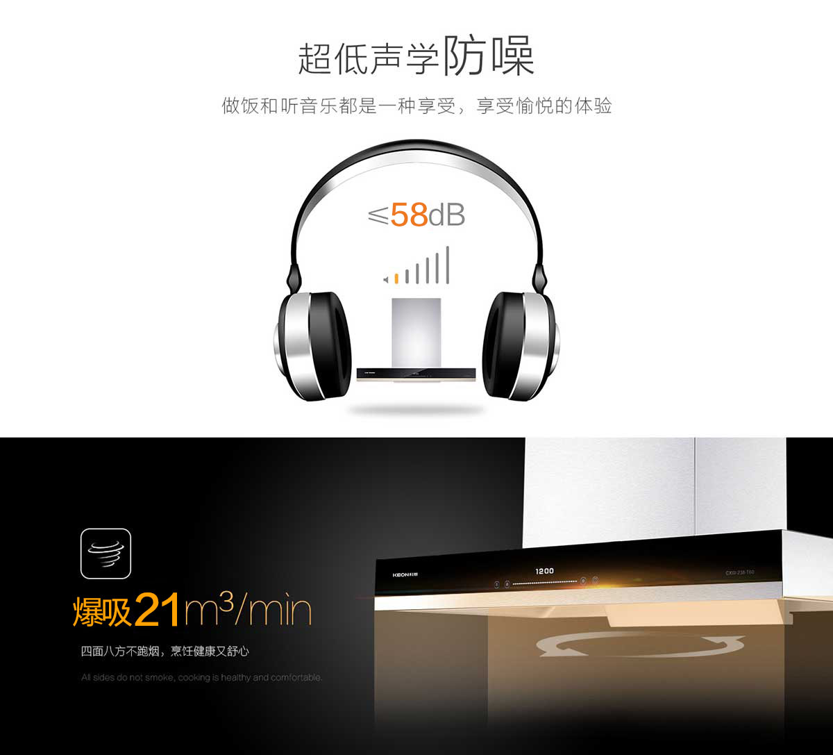 全腔900MM攏煙區,比普通煙腔更寬更深,有效鎖住油煙不外溢。