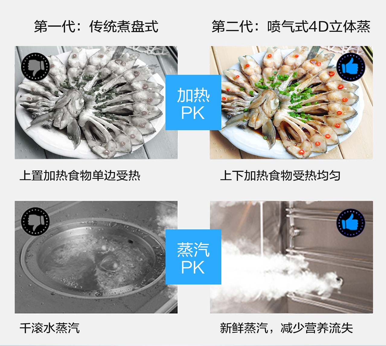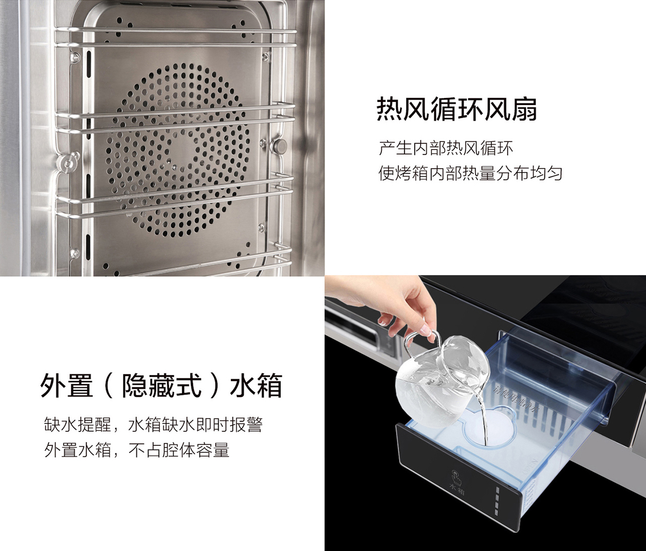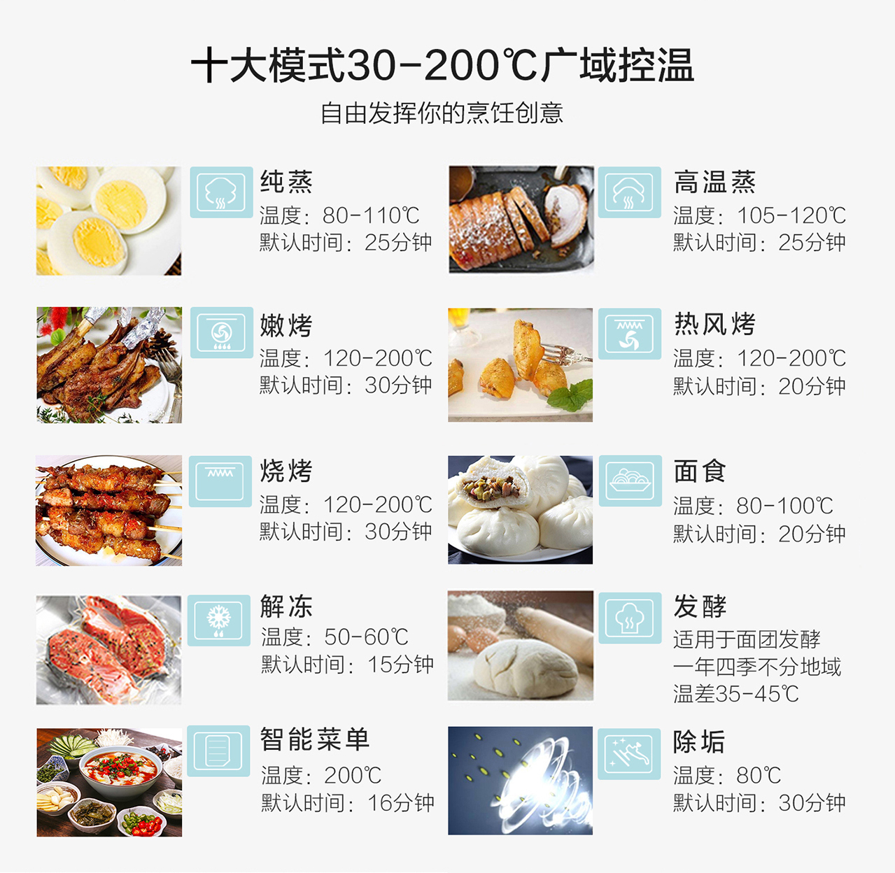 62L大容量食品級(jí)304不銹鋼內(nèi)膽,上下4層設(shè)計(jì),9種蒸烤模式。