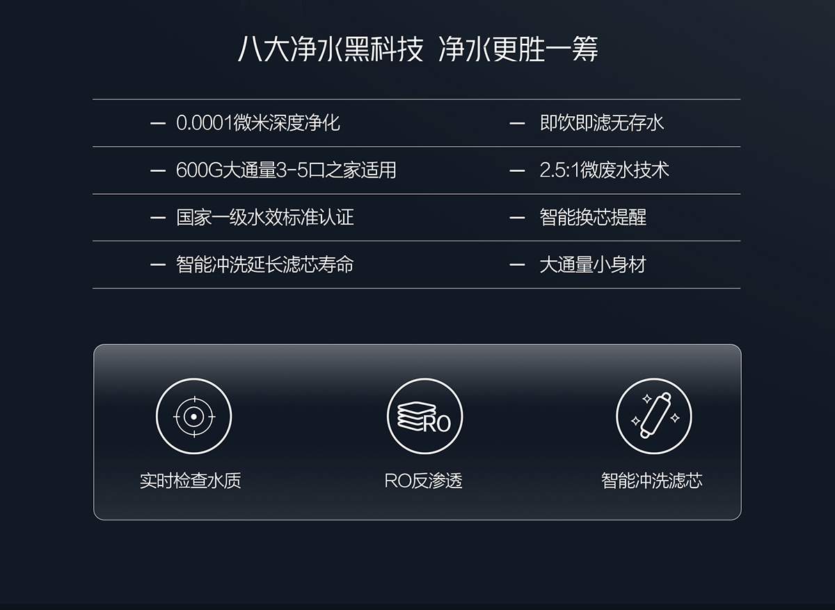 • 5年RO長效續(xù)航,高精度反滲透濾芯