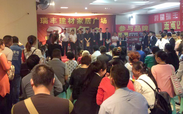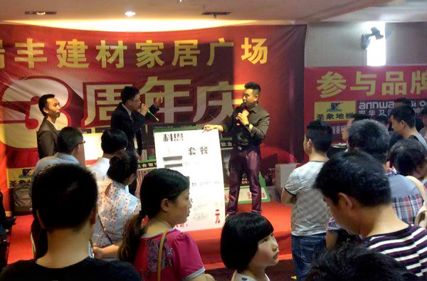 周年慶活動(dòng)現(xiàn)場,大批業(yè)主聚集在瑞豐建材家居廣場,共同慶祝瑞豐建材3周年的生日。而瑞豐建材為了回饋廣大業(yè)主的厚愛,聯(lián)合全場商家為大家了準(zhǔn)備了精美的禮品與超值的優(yōu)惠。